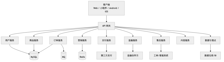 服务拆分:用户、商品、订单、营销、支付、金融、售后、内容